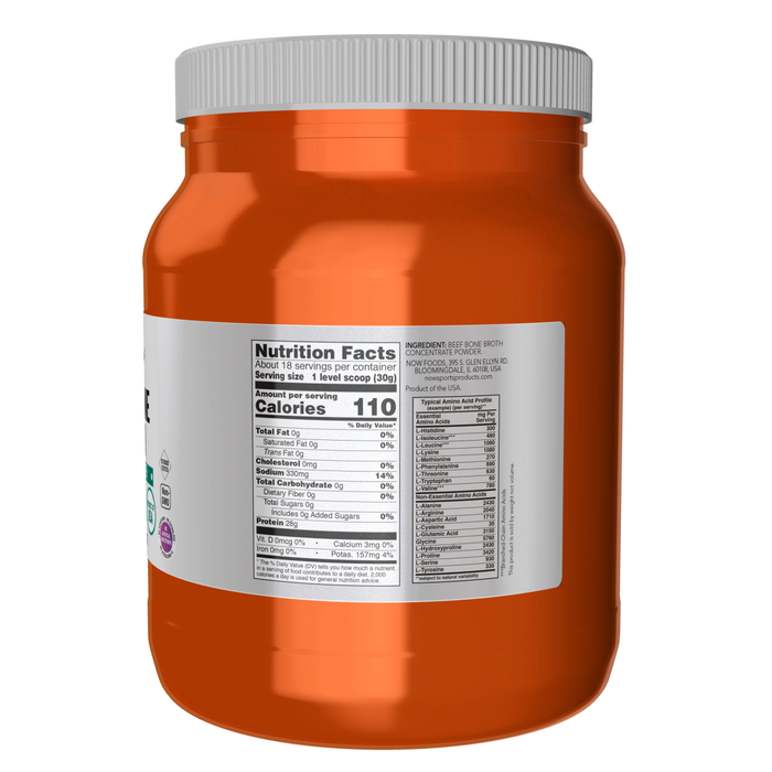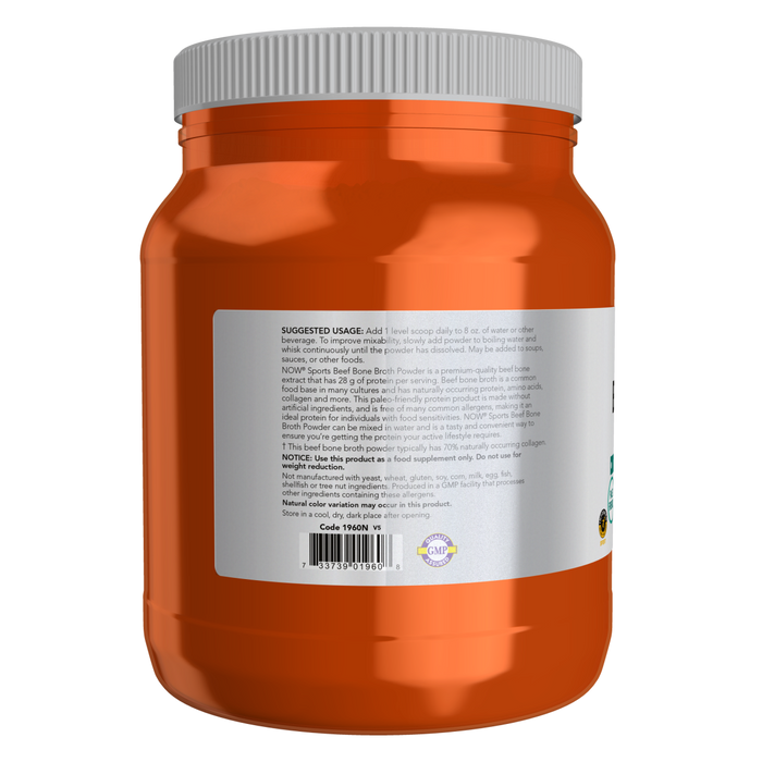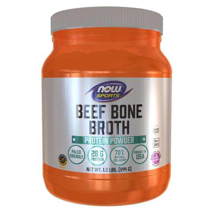 - El caldo de huesos de res en polvo de NOW® Sports es un extracto de hueso de res de primera calidad que tiene 28 g de proteína por porción. El caldo de huesos de res es una base alimenticia común en muchas culturas y tiene proteínas, aminoácidos, colágeno y más de origen natural.
