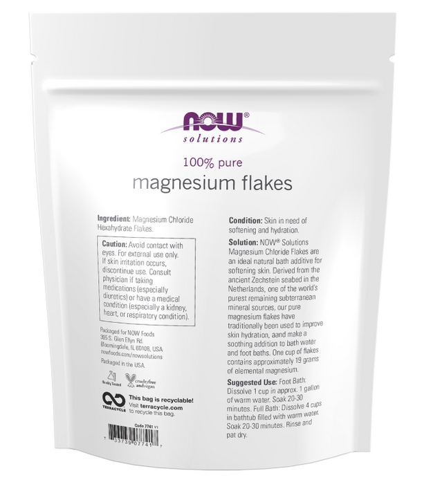 - Condición: Piel que de suavidad e hidratación. Solución: Las escamas de cloruro de magnesio de NOW® Solutions son un aditivo de baño natural ideal para suavizar la piel.