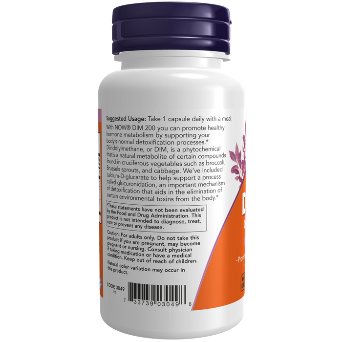 Con NOW ® DIM 200 puede promover un metabolismo hormonal saludable apoyando los procesos normales de desintoxicación de su cuerpo.* El diindolilmetano, o DIM, es un fitoquímico que es un metabolito natural de ciertos compuestos que se encuentran en las verduras crucíferas como el brócoli, las coles de bruselas y el repollo. Hemos incluido calcio-D-glucarato para ayudar a respaldar un proceso llamado glucuronidación, un importante mecanismo de desintoxicación que ayuda a eliminar ciertas toxinas ambientales del cuerpo.*