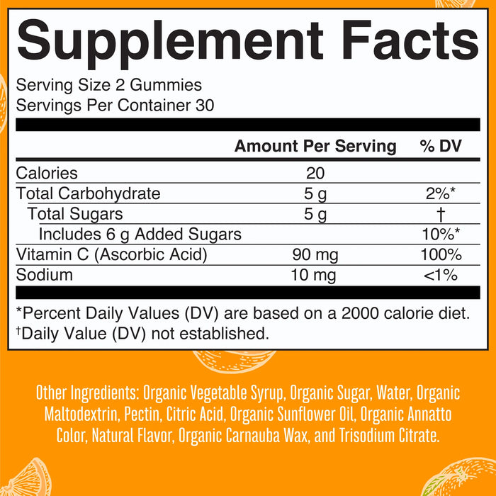 Deliciosas gomitas orgánicas USDA con vitamina C esencial para niños. ¡Solo dos de estas deliciosas gomitas con sabor a naranja ofrecen el 100 % del valor diario recomendado de vitamina C para niños de 4 años en adelante!