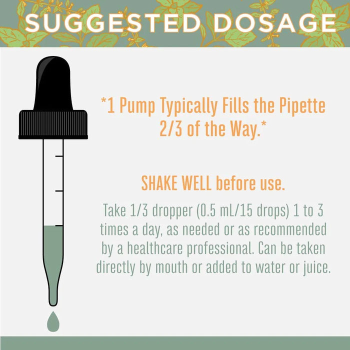 Agitar suavemente antes de usar. Los adultos toman hasta 15 gotas (0,5 ml) de 1 a 3 veces al día, o según lo recomendado por un médico o profesional de la salud. Puede tomarse directamente por vía oral o agregarse al agua.