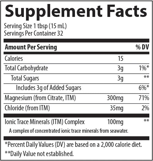 Uso sugerido: AGITAR BIEN. Tome 1 cucharada al día para rematar o complementar completamente su dieta. Reduzca la porción a <>/<> cucharada si es la primera vez que toma magnesio líquido. Mezclar con agua, su bebida favorita o tomar recto. El exceso de magnesio puede causar un efecto laxante.