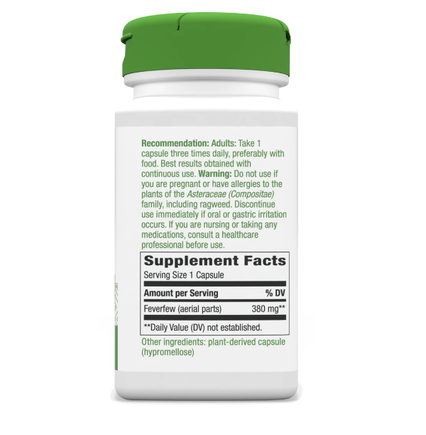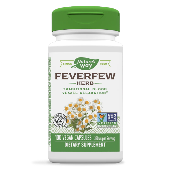 • Nature's Way Feverfew se utiliza tradicionalmente para favorecer la relajación de los vasos sanguíneos.*